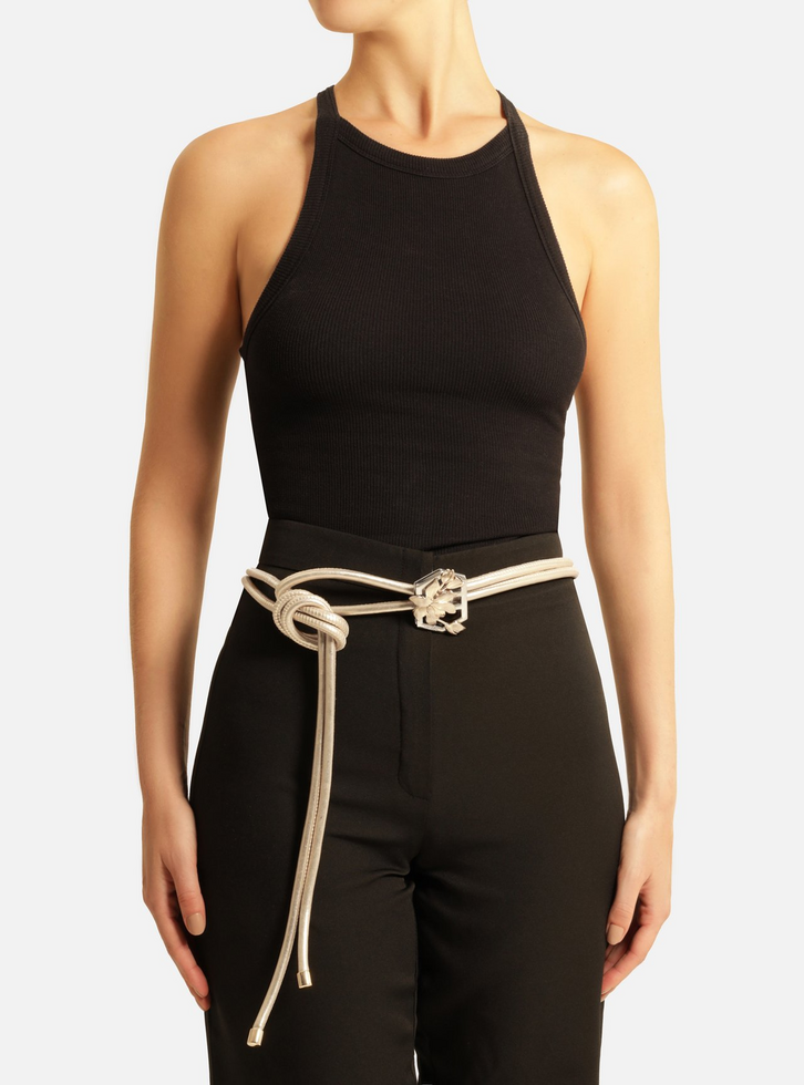 Cinto feminino dourado de couro em tira fina de rolotê. Para uso na cintura, é ajustável por nó e tem detalhe em metal hexagonal em aço com flor dourada.