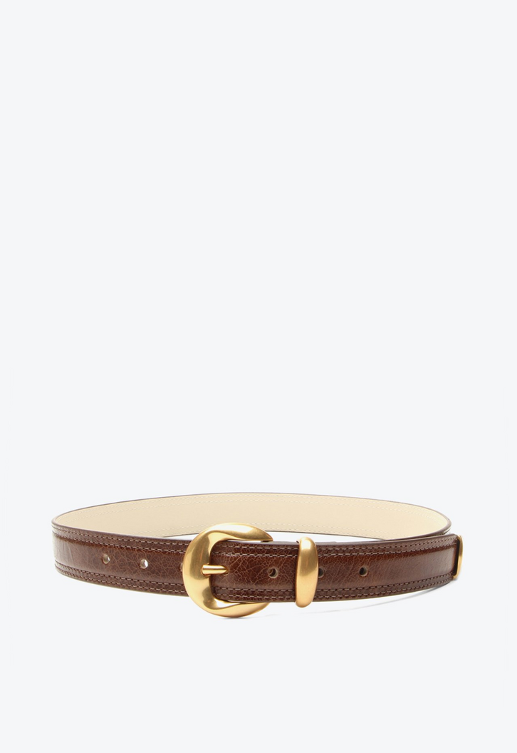 Cinto Jolene Marrom, com acabamento elegante e visual atemporal. A fivela dourada de formato orgânico ganha destaque, acompanhada por passantes e ponteira metálicos que elevam o design. Versátil e fácil de combinar, é o acessório ideal para finalizar produções com estilo e personalidade. Um essencial que faz a diferença no look.