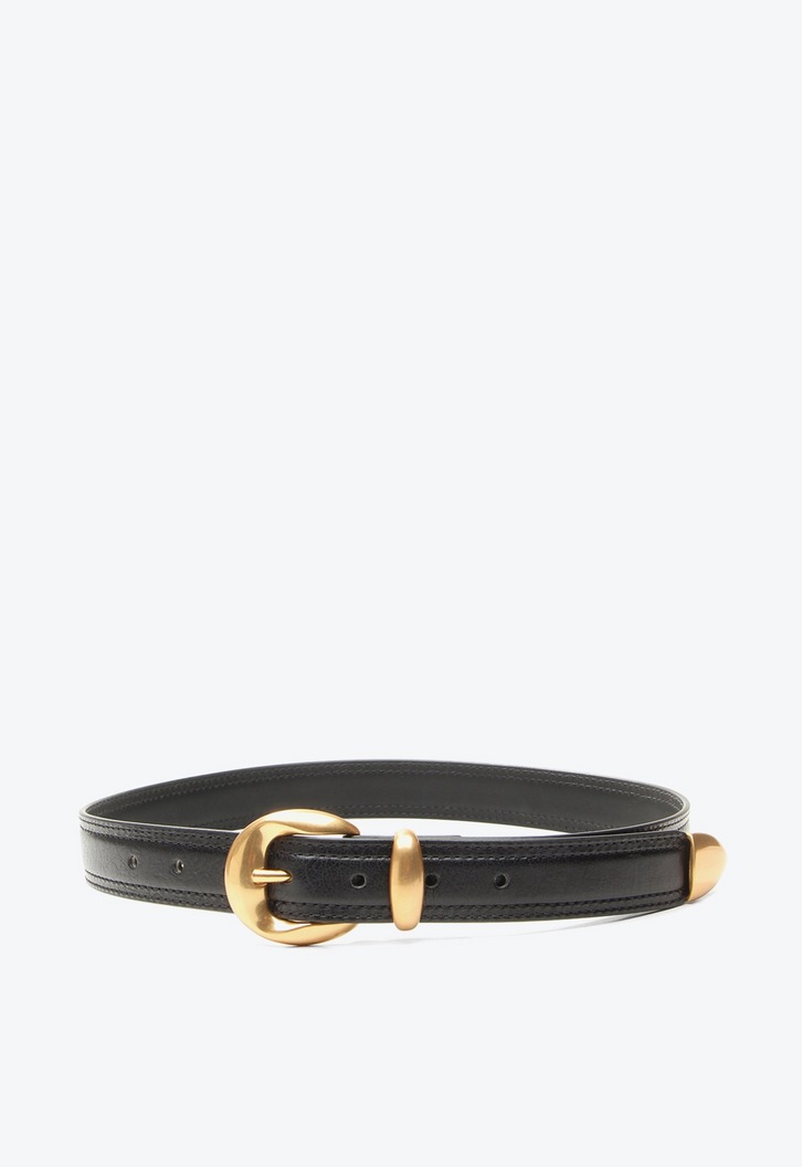 Cinto Jolene Preto, com acabamento elegante e visual atemporal. A fivela dourada de formato orgânico ganha destaque, acompanhada por passantes e ponteira metálicos que elevam o design. Versátil e fácil de combinar, é o acessório ideal para finalizar produções com estilo e personalidade. Um essencial que faz a diferença no look.