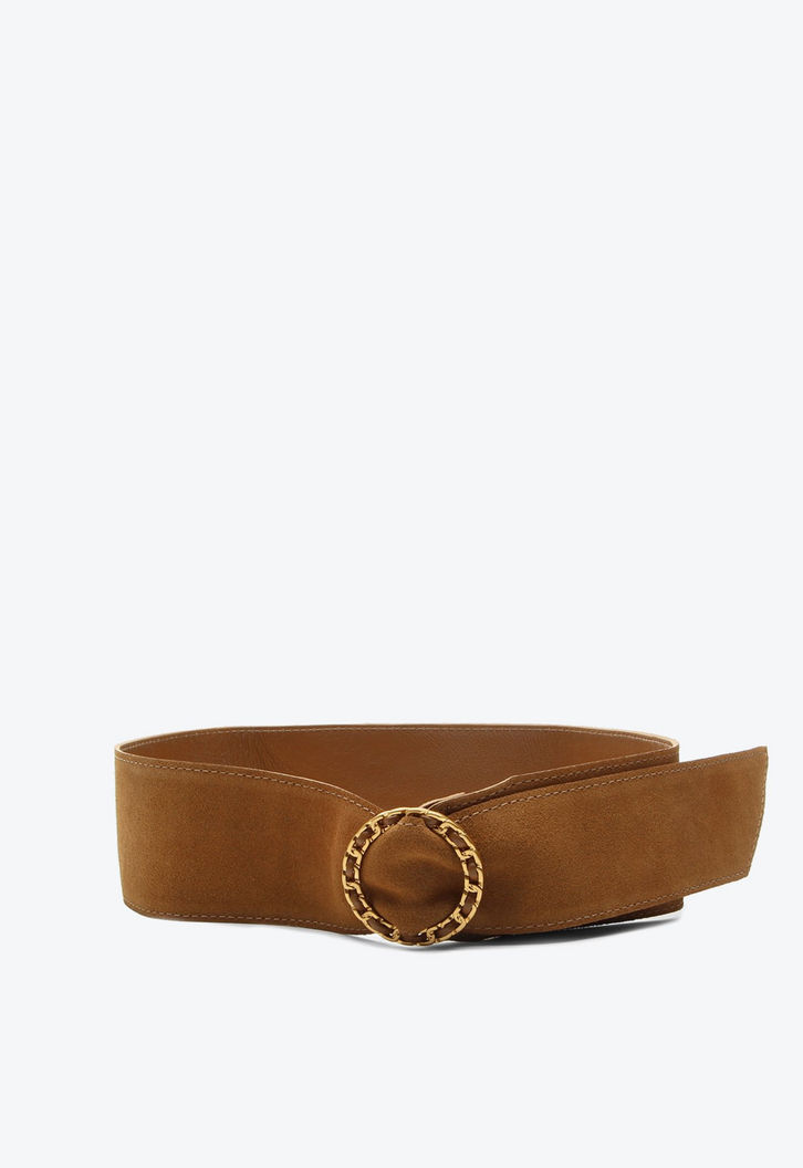 Cinto largo em camurça caramelo com fivela redonda. Um modelo que traduz elegância com personalidade. Em camurça caramelo, ele aposta na textura para destacar o visual, enquanto a fivela redonda adiciona charme e presença à produção. Perfeito para elevar looks com um toque marcante e atual.