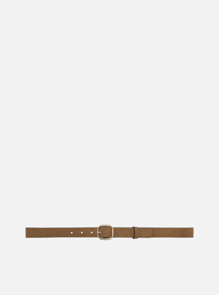 Cinto de couro acamurçado feminino marrom. O acessório vem em tira fina e possui fivela de metal, dourada e quadrada com cantos arredondados. Para uso na cintura, é regulável e tem passador em tira de couro.