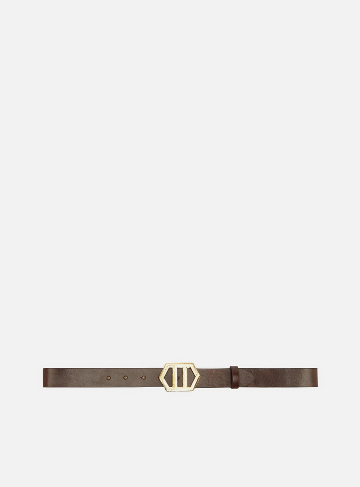 Cinto marrom de couro. O acessório vem em tira média e possui fivela metálica dourada em formato geométrico sextavado, identidade da marca. Conta com passador na mesma cor do cinto e ajuste regulável.