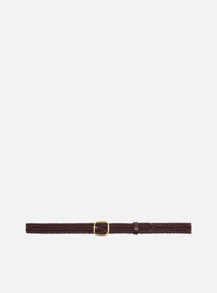 Cinto marrom de couro em tressê. O acessório vem em tira média e possui fivela de metal, dourada, quadrada e arredondada nas laterais. Para uso na cintura, é regulável e tem passador em tira de couro.