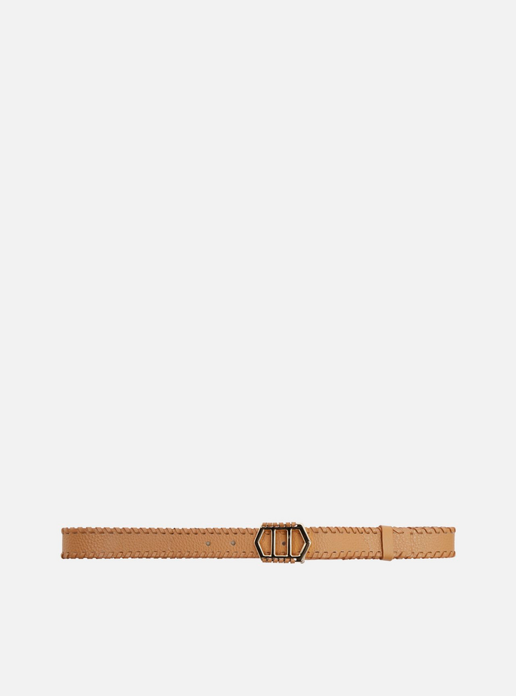 Cinto feminino marrom. O acessório tem tira média, com bordas perfuradas e detalhe de tira fina entrelaçada por todo o contorno. Possui fivela metálica dourada em formato geométrico vazado e passador em tira do mesmo material. Para uso na cintura, é regulável.