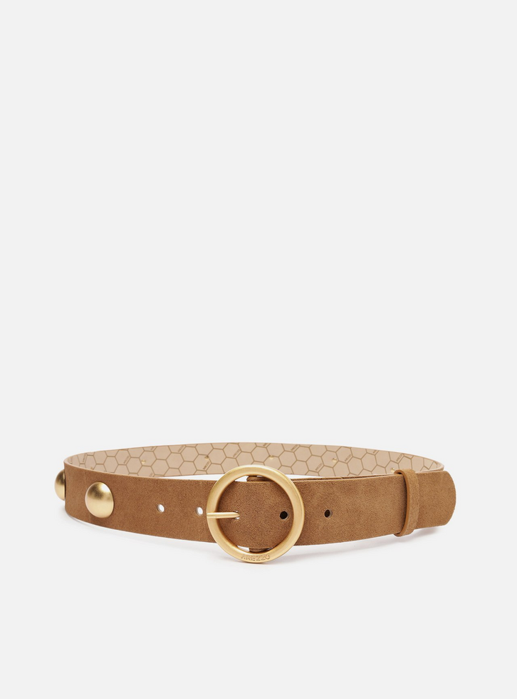 Cinto feminino em suede marrom. O acessório vem em tira média com aplicação de semi-esferas douradas. Traz fivela de metal, dourada e redonda. Para uso na cintura, é regulável e tem passador em tira.