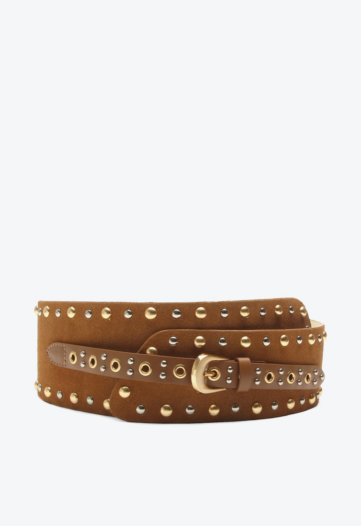 Cinto largo em camurça caramelo. Com aplicações que reforçam seu estilo autêntico, esse modelo é puro boho. Seu design marcante e o toque rústico da camurça trazem um charme único para qualquer look. Ideal para marcar a cintura e completar produções com jeans e botas.