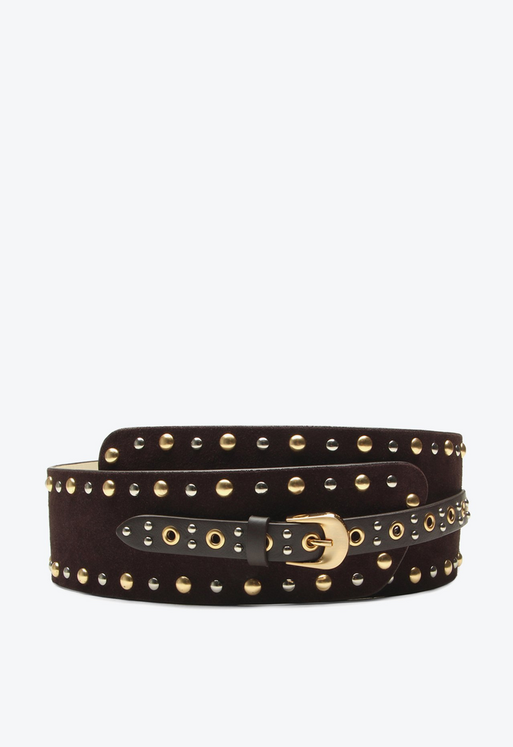 Cinto largo em camurça marrom. Com aplicações que reforçam seu estilo autêntico, esse modelo é puro boho. Seu design marcante e o toque rústico da camurça trazem um charme único para qualquer look. Ideal para marcar a cintura e completar produções com jeans e botas.
