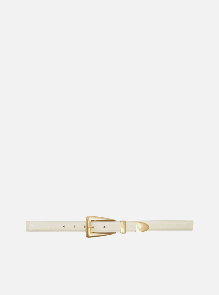 Cinto feminino off white em couro. O acessório tem tira média e acabamento liso. Possui fivela dourada moderna em metal com efeito escovado, além de passador e ponteira metálicos no mesmo tom. Parte interna em material com monograma Arezzo. Para uso na cintura ou no quadril, é ajustável.