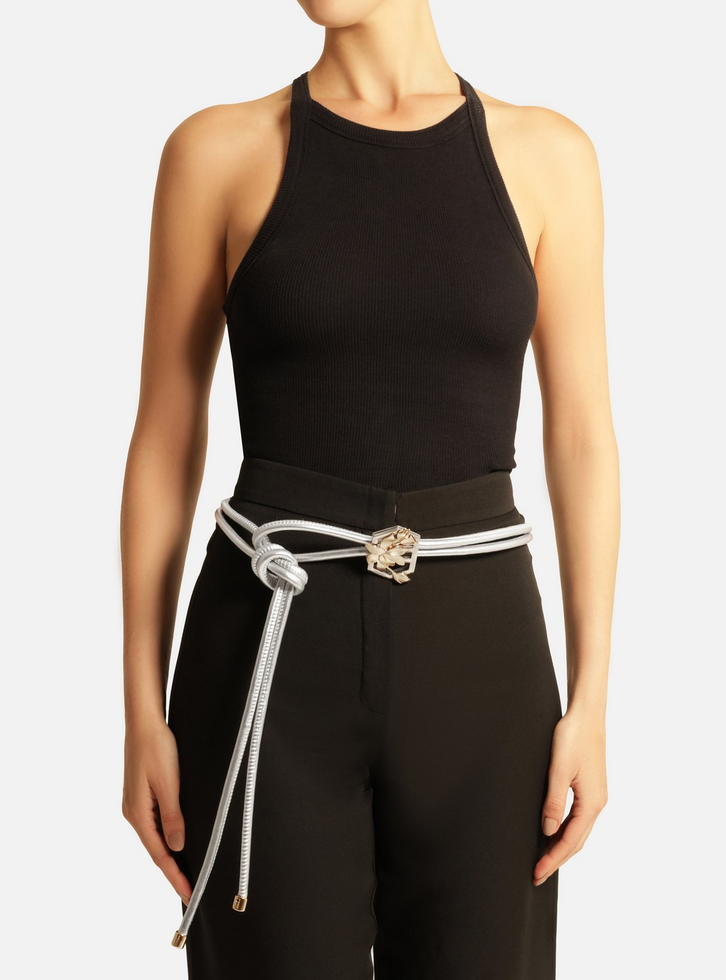 Cinto feminino prata de couro em tira fina de rolotê. Para uso na cintura, é ajustável por nó e tem detalhe em metal hexagonal em aço com flor dourada.