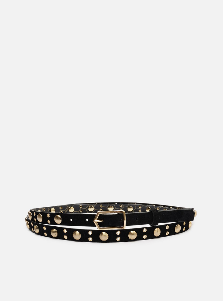 Cinto preto em couro acamurçado com aplicação de rebites em diferentes tamanhos. O acessório vem em tira fina e possui fivela de metal, dourada e com ponta triangular. Para uso na cintura, é regulável e tem passador em tira de couro.