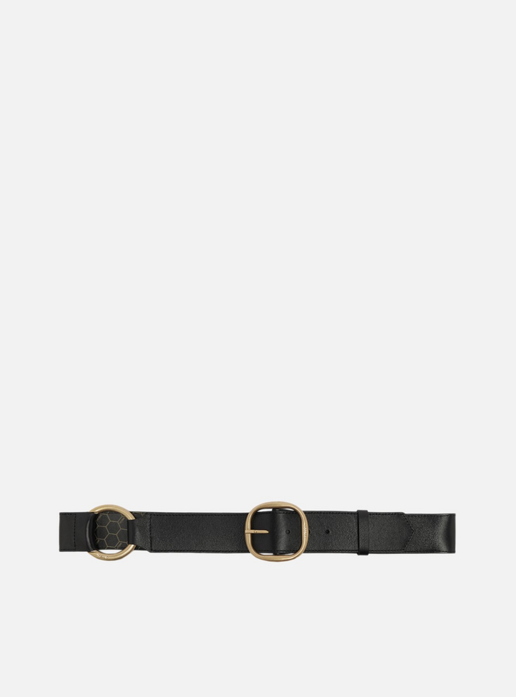 Cinto feminino preto de couro. O acessório vem em tira larga e possui uma argola metálica interposta na tira, além de fivela de metal dourada e arredondada. Para uso na cintura, é regulável e tem passador em tira de couro.