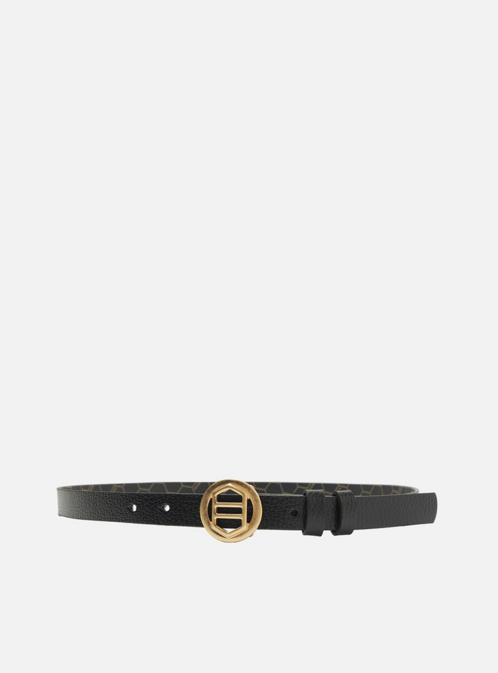 Cinto feminino preto de couro em tira média. O acessório tem fivela metálica redonda, vazada e com detalhe geométrico no centro. Parte interna em material com monograma Arezzo. Para uso na cintura, é ajustável e tem passadores em tiras de couro.