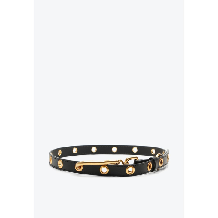 Cinto fino preto em couro com detalhes dourados. Sabe aquele toque que faltava no visual? Com ele você vai arrasar. Aposte em visuais com blusas oversized para uma pegada cool.