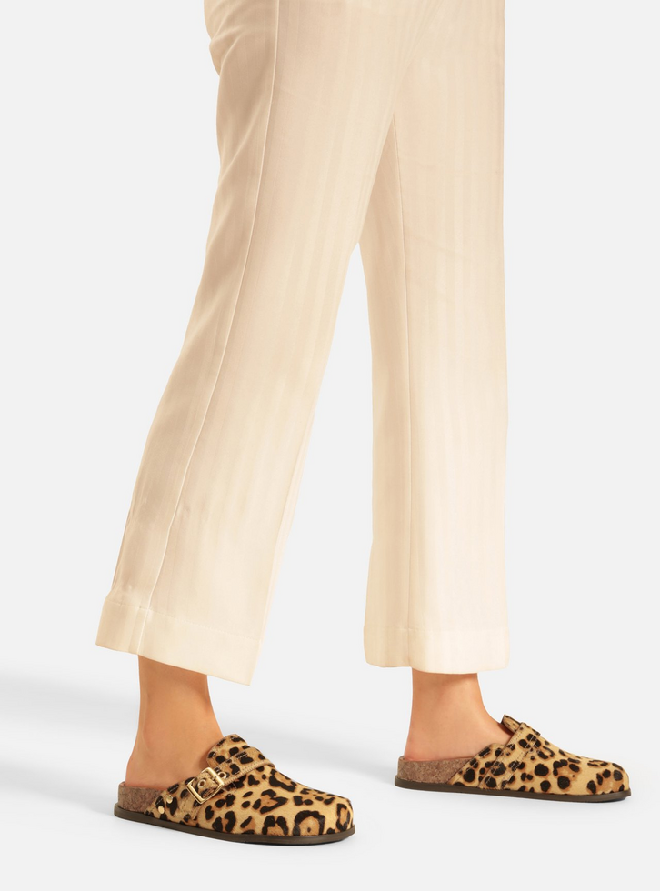 Clog em pelo com estampa de onça. O sapato tem salto rasteiro, palmilha marrom com formato anatômico e inscrição do nome da marca. Possui solado flatform em cortiça, base emborrachada e formato arredondado na ponta. Aberta atrás, traz cabedal fechado com recortes e aplicação de tira de couro transpassada na horizontal com fivela metálica lateral, além de rebites.