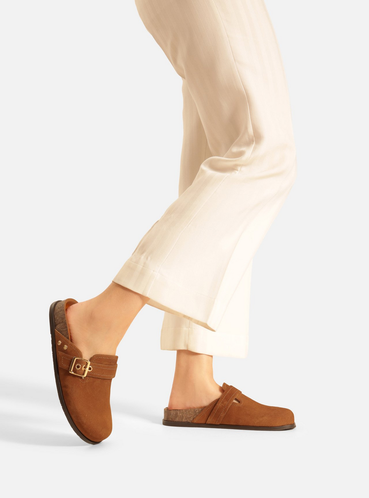Clog marrom em camurça. O sapato tem salto rasteiro, palmilha da cor do sapato com formato anatômico e inscrição do nome da marca. Possui solado flatform em cortiça, base emborrachada e formato arredondado na ponta. Aberta atrás, traz cabedal fechado com recortes e aplicação de tira de couro transpassada na horizontal com fivela metálica lateral, além de rebites.