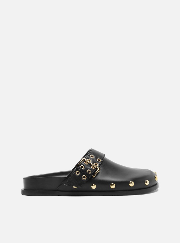 Clog preta em couro. O sapato tem salto rasteiro, palmilha da cor do sapato com formato anatômico e inscrição do nome da marca. Possui solado flatform, base emborrachada e formato arredondado na ponta. Aberta atrás, traz cabedal fechado com recortes e aplicação de tira larga transpassada na horizontal com fivela metálica lateral.