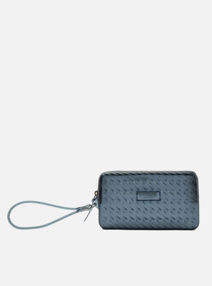 Clutch azul em plástico injetado translúcido. O acessório tem formato quadrado e compacto e capas em textura que imita tiras de cordão torcido. Traz fecho superior em zíper e puxador emborrachado com inscrição em alto-relevo do nome da marca. Com tag do nome da marca na capa frontal e alça de mão lateral tramada.
