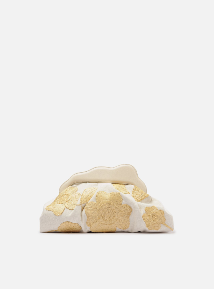 Bolsa feminina clutch média Off-white em linho. O acessório tem formato soft e alongado e detalhe em bordados florais em palha nas capas. Traz alça lateral regulável e removível. Possui parte superior em faixa lisa de couro e recorte ondulado. Com fecho interno em ímã invisível.