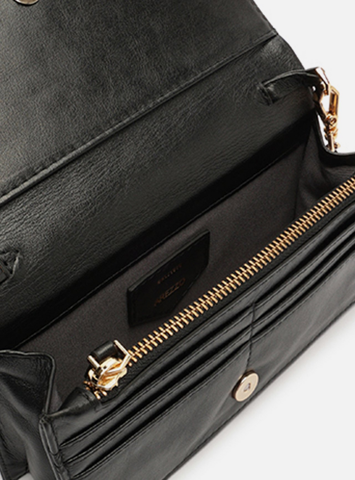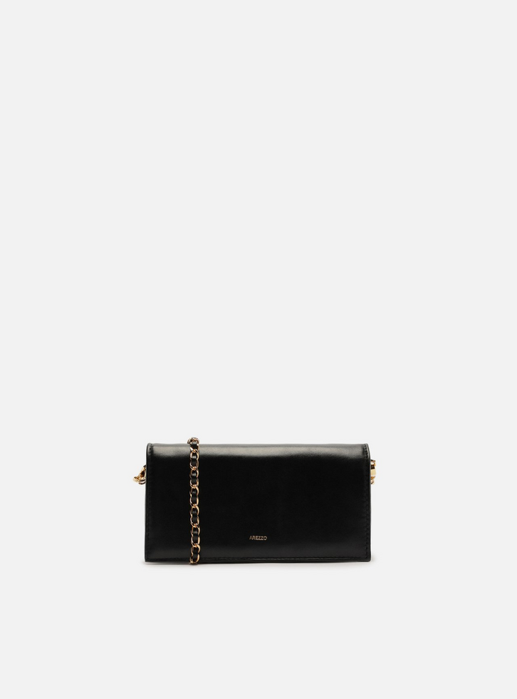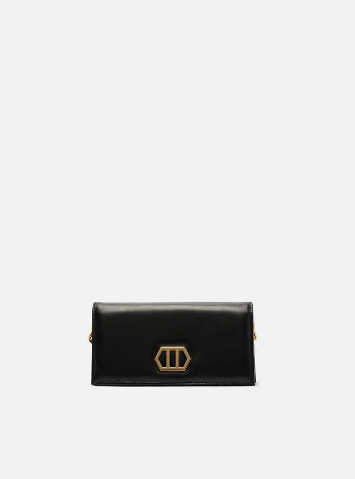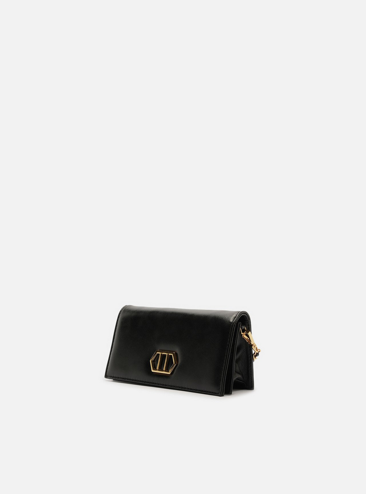 Bolsa clutch preta em couro. O acessório tem formato retangular. Possui alça tiracolo longa em corrente metálica e tira de couro transpassada, regulável e com pingente em esfera de metal. Possui fecho em tampo e imã interno. Com aplicação de metal geométrico e vazado na capa. Interno com divisória, bolso fechado por zíper e porta-cartões.