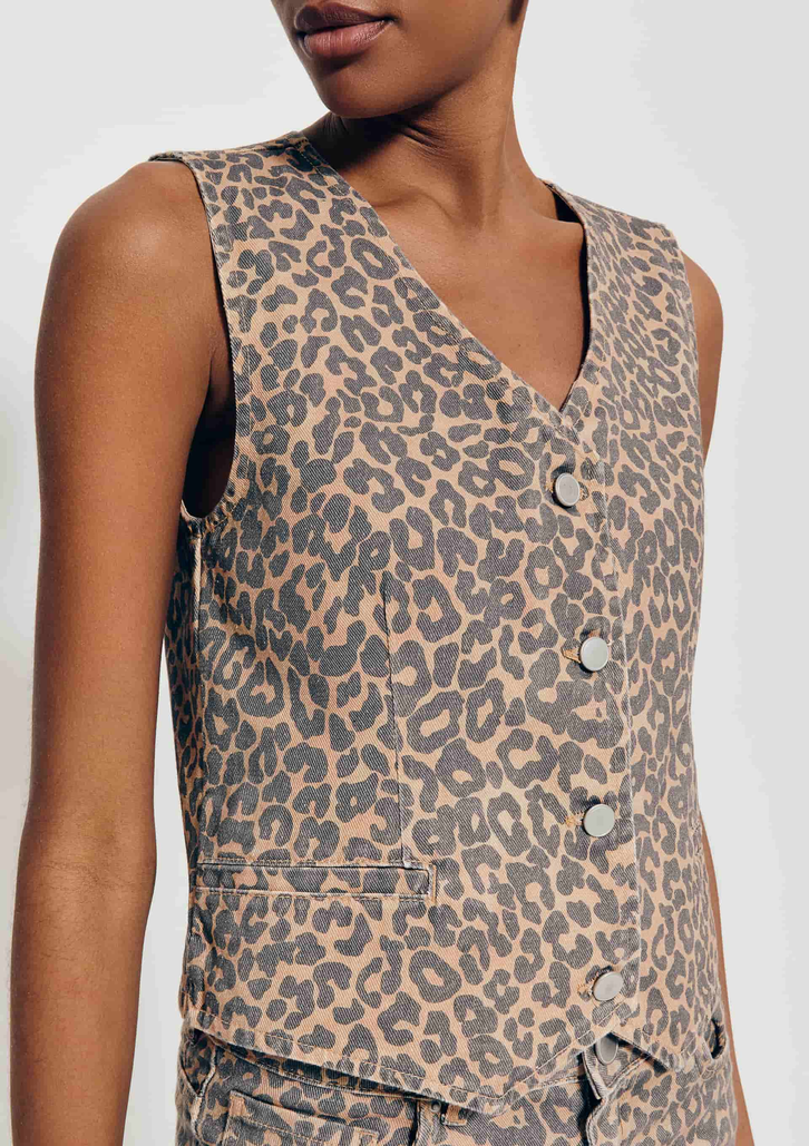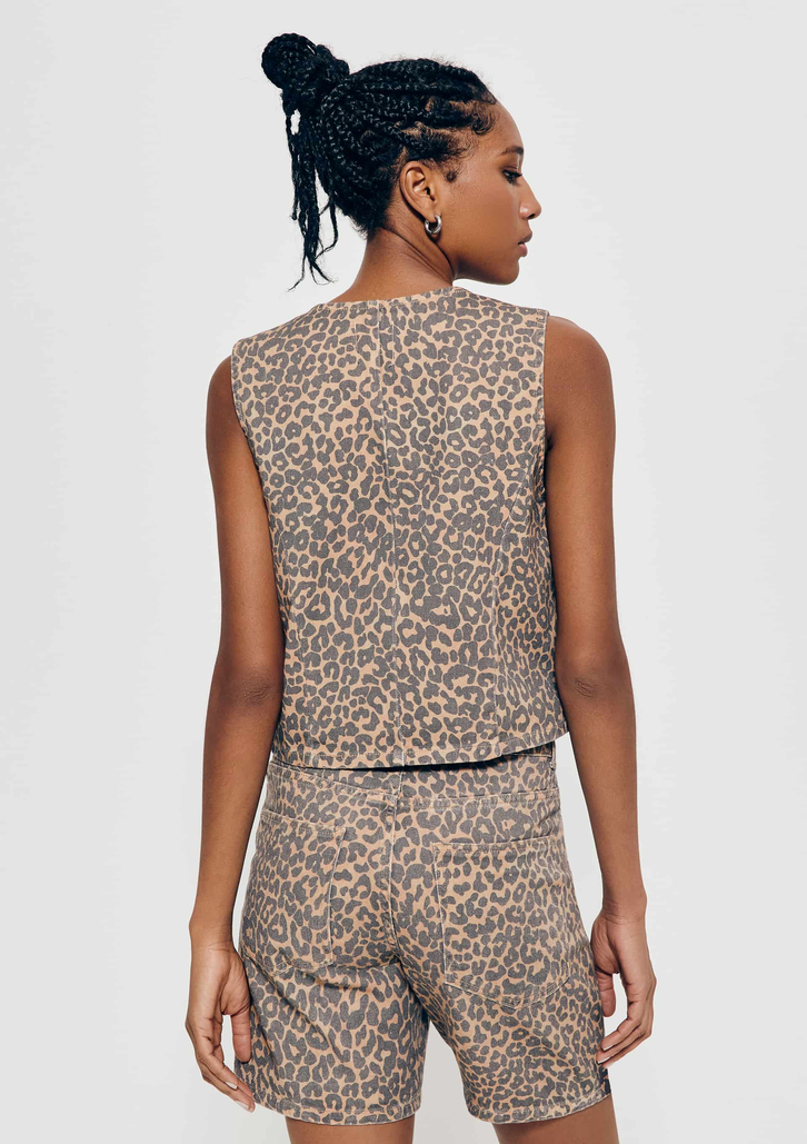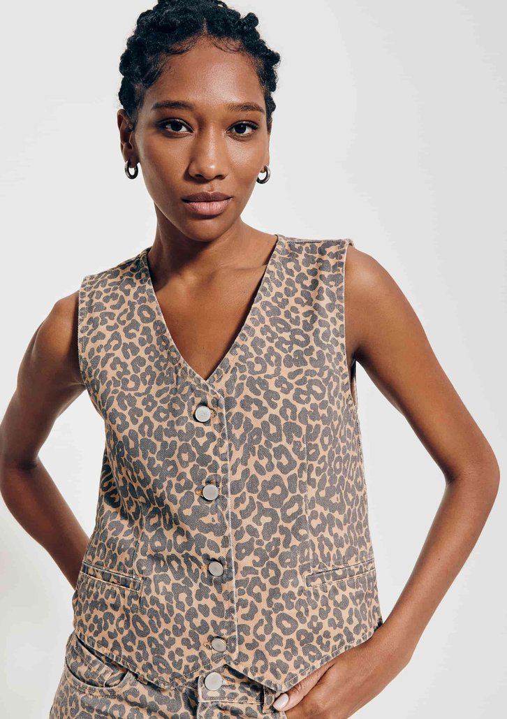 Colete feminino elaborado em sarja com estampa de onça. Possui silhueta regular, levemente solta do corpo.