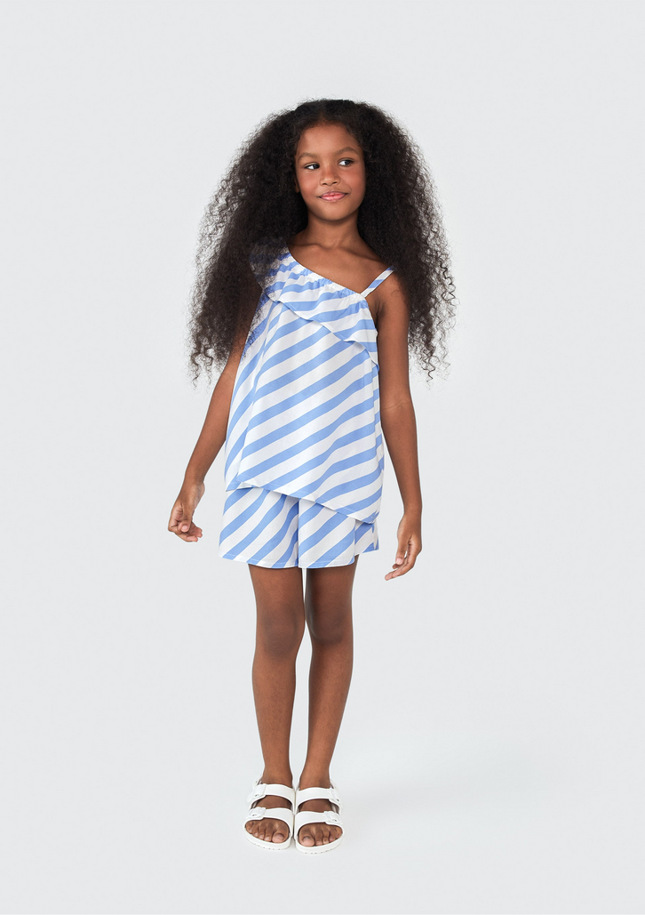 Regata de modelagem solta, um ombro só com babado aplicado. Shorts de modelagem clochard, cós com elástico. Peças estampadas em tecido plano.