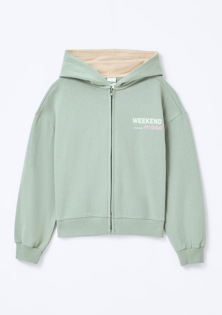 Conjunto em moletom sem pelucia com modelagem regular, levemente solta ao corpo. A jaqueta possui capuz, estampa frontal e fecho em zíper. Shorts com modelagem runner, cós de elástico com cadarço de enfeite e barra arredondada com friso contrastante.Detalhes da peça:Moletom não peluciado