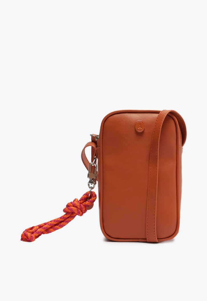 Mini bag tiracolo laranja em material semelhante a couro. O modelo tem formato retangular, laterais arredondadas e alça longa e fina. Traz fecho superior em zíper e puxador em tira. Com tag A na capa frontal, que representa a inicial do nome da marca, e bag charm em cordão colorido com nó e pingente, preso na lateral.