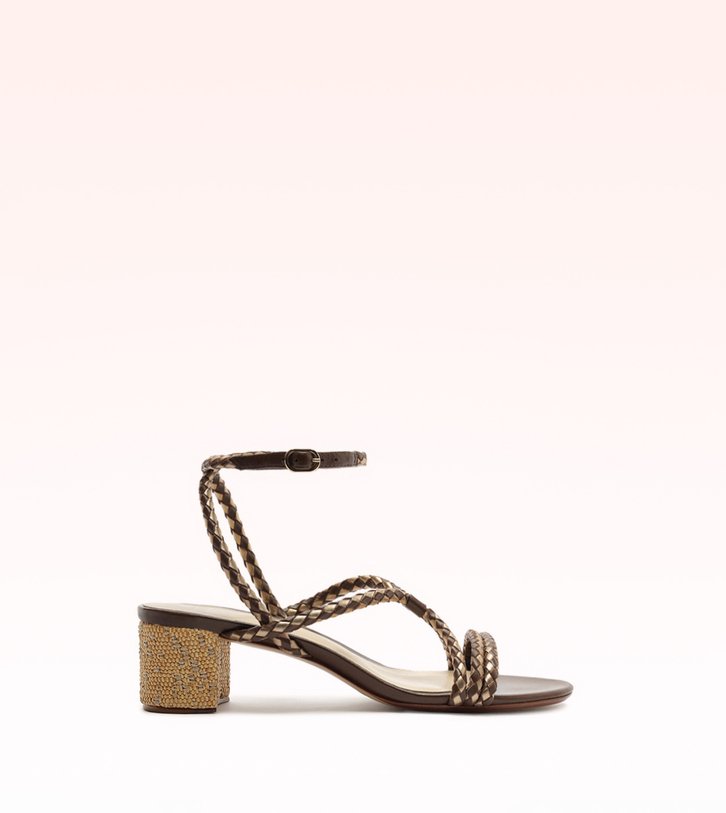 Sandália com tiras trançadas em couro a fio, que envolvem o pé com leveza e acabamento artesanal sofisticado. O salto de 45mm e a cepa forrados em ráfia natural entremeada por fio metálico conferem textura orgânica e brilho sutil. Ideal para composições elegantes com conforto no dia a dia.