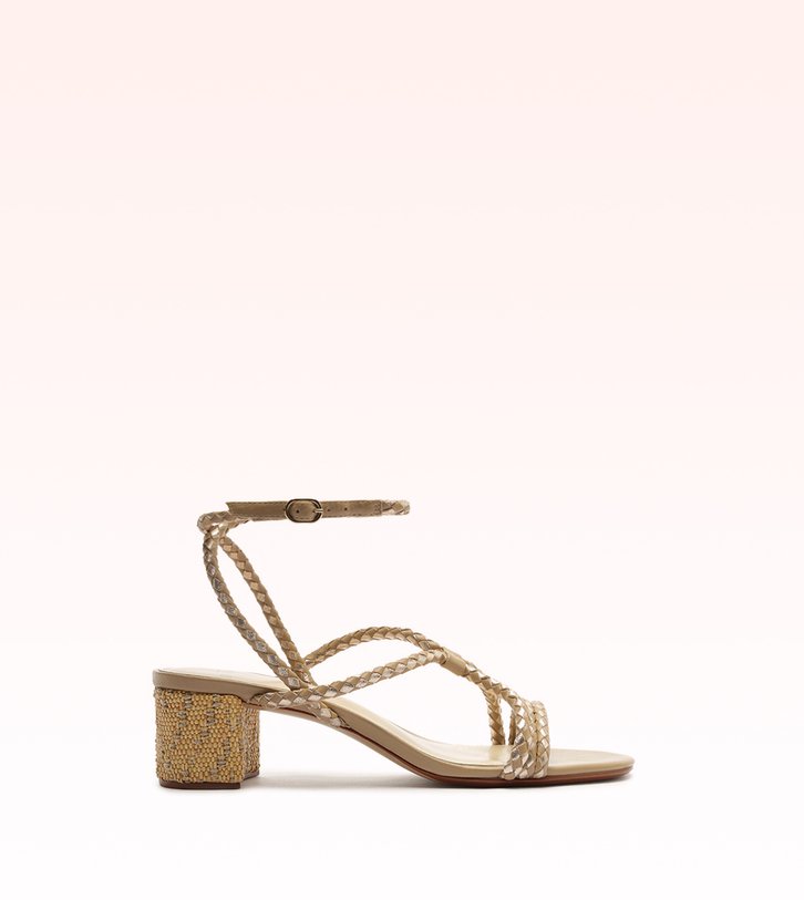 Sandália com tiras trançadas em couro a fio, que envolvem o pé com leveza e acabamento artesanal sofisticado. O salto de 45mm e a cepa forrados em ráfia natural entremeada por fio metálico conferem textura orgânica e brilho sutil. Ideal para composições elegantes com conforto no dia a dia.
