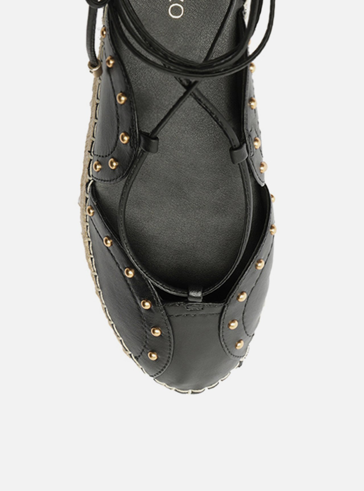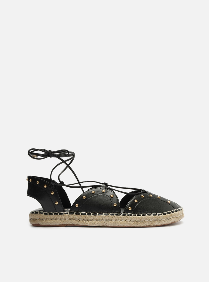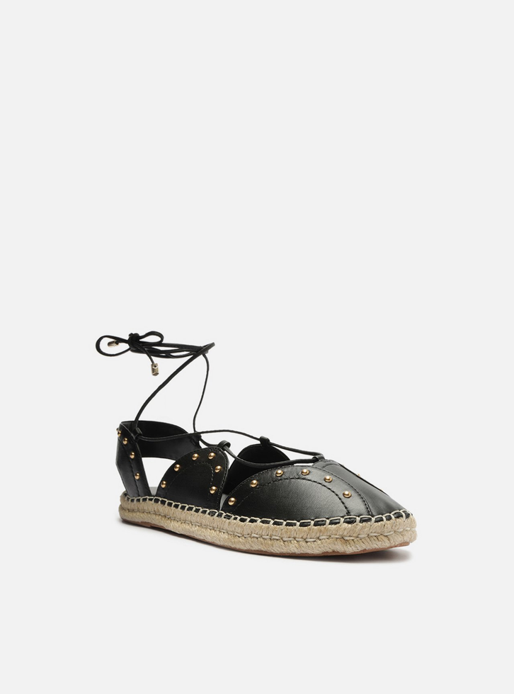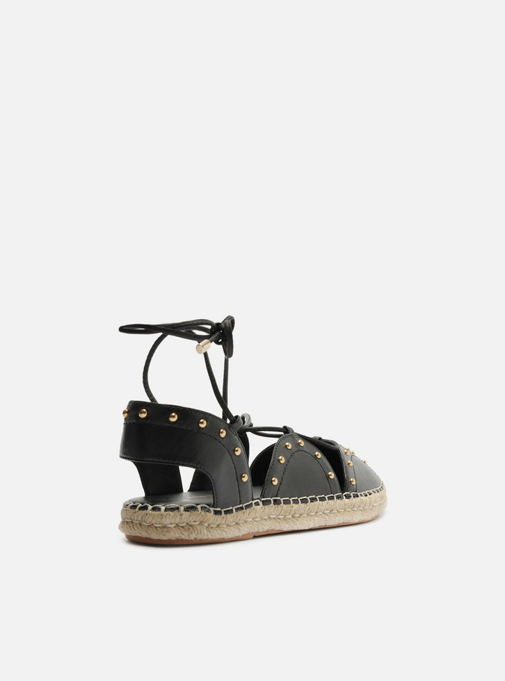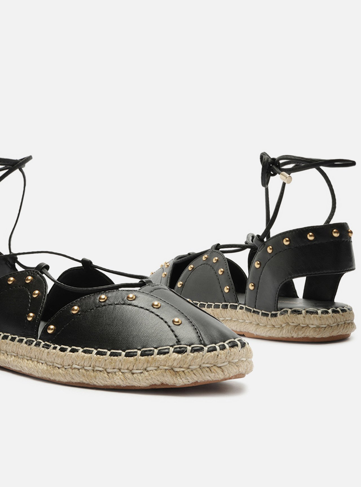 Espadrille preta de couro. O modelo tem salto rasteiro, base revestida em palha com costuras e bico redondo. Traz cabedal recortado nas laterais e tira no calcanhar, ambos com aplicação de studs no contorno. Traz tiras finas conectadas ao cabedal, que se cruzam no peito do pé, contornam o tornozelo e as pernas e fecham em amarração superior. Com palmilha preta e inscrição do nome da marca, exibe todo o peito do pé e calcanhar.