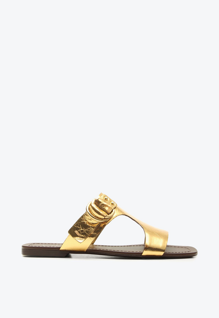 Flat Alice em couro dourado. Produzida em couro cracked, esta flat combina conforto e personalidade mesmo sem salto, trazendo um toque mais sofisticado ao visual. Versátil e elegante, é perfeita para compor looks com vestidos longos, ressaltando a essência leve e descontraída do verão. Ideal para quem busca um calçado que complemente os looks com delicadeza, charme e autenticidade ao longo da temporada.