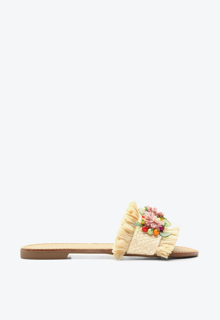 Flat Belluno bege palha. O cabedal em palha natural recebe detalhes de flores coloridas e franjas, criando um visual delicado e cheio de charme. Versátil e fashion, essa flat é ideal para quem busca praticidade sem abrir mão do estilo, adicionando cor e frescor a produções casuais e passeios de fim de semana, tornando-se uma escolha certeira para quem quer destacar o look de forma sutil e delicada.