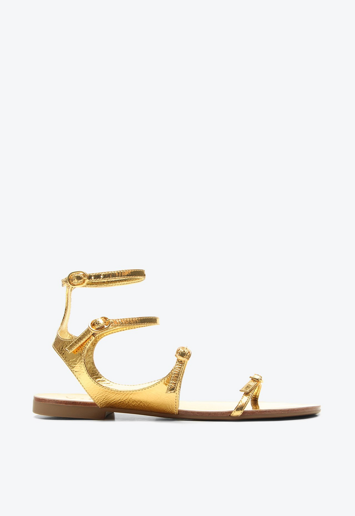 Flat Belluno em couro dourado. Com tiras delicadas ajustáveis por fivelas, este modelo estilo gladiadora envolve o pé com conforto e segurança, sem perder o charme. O acabamento em couro dourado confere brilho discreto e sofisticação, tornando a flat perfeita para complementar visuais leves de verão. Versátil e elegante, valoriza produções com saias, vestidos ou shorts, adicionando um toque moderno e delicado a cada look.