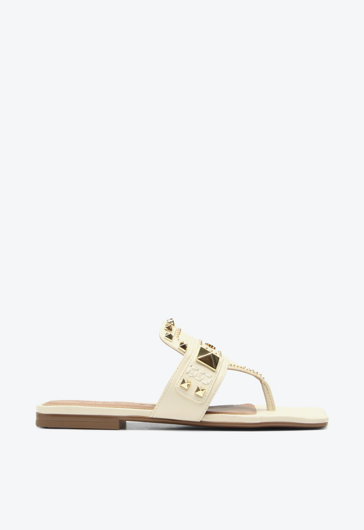 A flat Cascais em couro bege destaca-se pelo design minimalista e sofisticado, realçado pelas aplicações de studs dourados em diferentes formas que conferem personalidade ao modelo, ela eleva tanto looks casuais com jeans e camiseta quanto produções mais elaboradas, reafirmando a tendência dos metais como ponto de luz nas composições urbanas.