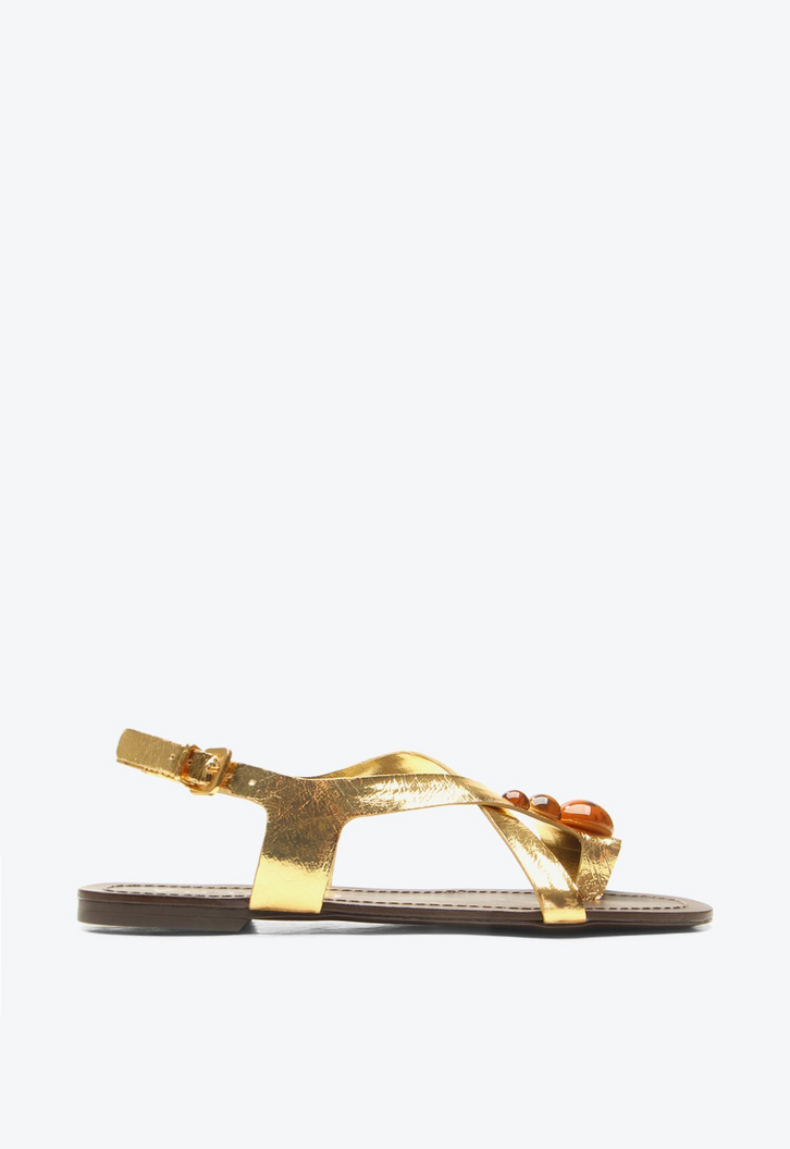 Flat feminina Coimbra dourada em couro. Com tiras delicadas e adornos frontais em pedras, combinando charme e praticidade em um visual leve e confortável. Ideal para a temporada de verão, valoriza produções descontraídas e versáteis, trazendo frescor e estilo aos looks do dia a dia. O design elegante e os detalhes em pedras adicionam sofisticação, tornando a flat uma escolha essencial para composições que pedem conforto sem abrir mão do toque fashion.