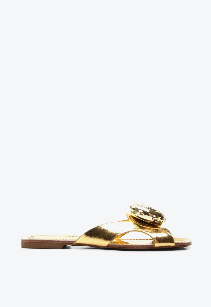 Flat Celene dourada em couro. Uma criação autoral VCZ onde o calçado assume o papel de protagonista, elevando até os looks mais leves dos dias quentes. O acabamento em couro metalizado cria um efeito moderno e impactante, refletindo brilho e personalidade. O destaque fica por conta do maxi adorno em formato de concha, que traduz o espírito contemporâneo e sofisticado da marca. Um design artístico que une naturalidade, autenticidade e estilo.
