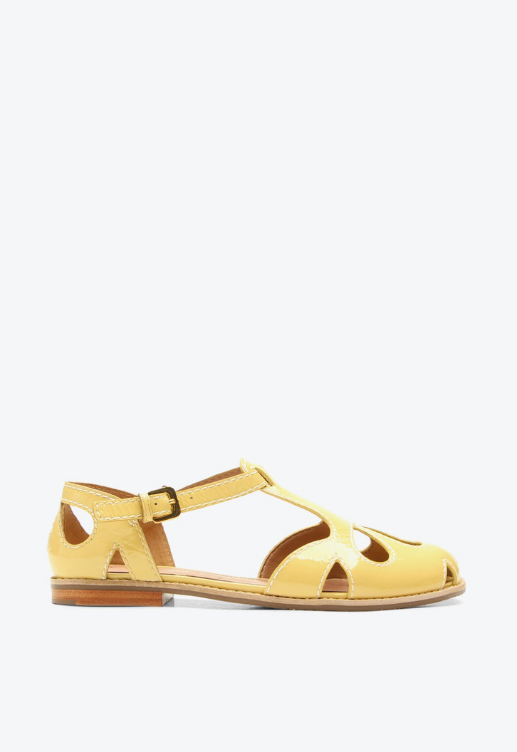 Flat Gia em verniz amarelo. Com design delicado e fechamento frontal em tiras, essa flat une conforto e leveza em cada passo. O acabamento em verniz adiciona um brilho sutil, enquanto o formato versátil garante um toque romântico às produções. Ideal para acompanhar looks frescos, é aquela peça que traduz o clima do verão com charme e feminilidade.