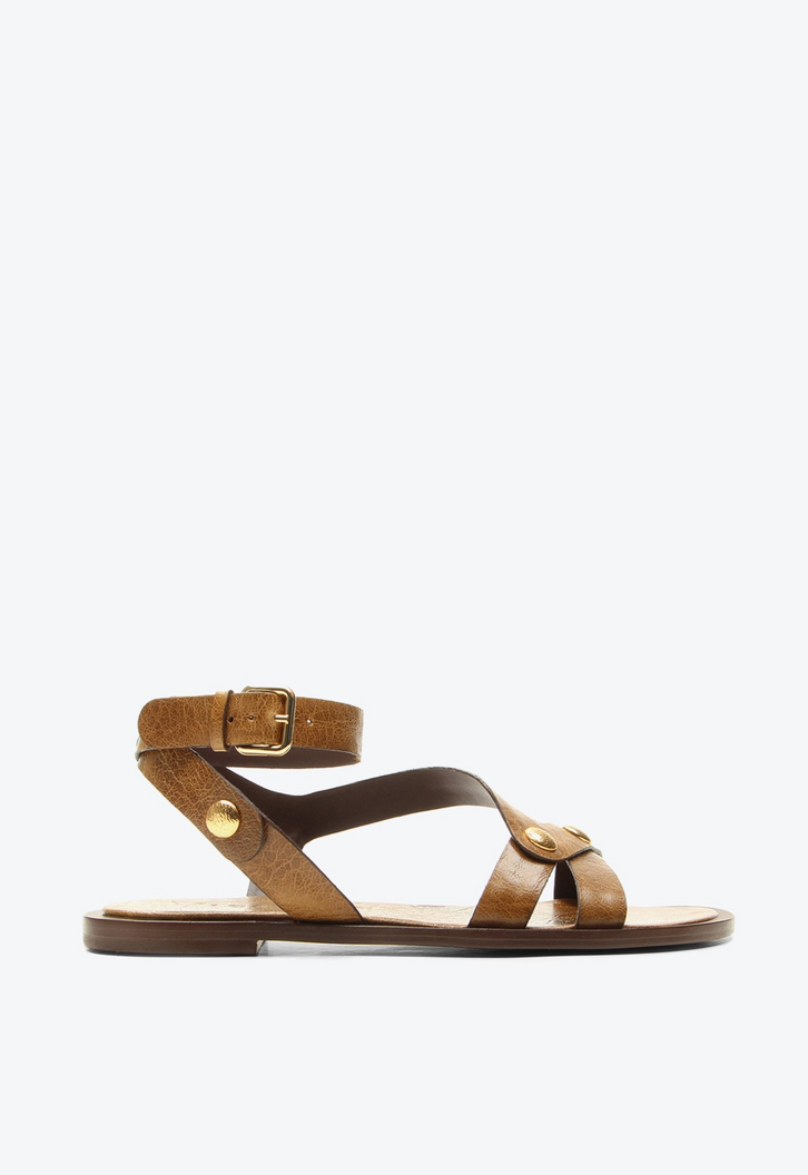 Flat Haia em couro caramelo. No estilo gladiadora, essa flat é a união perfeita entre ousadia e sofisticação. Suas tiras mais grossas criam um visual marcante, enquanto os detalhes metalizados acrescentam brilho e elegância na medida certa. A fivela no tornozelo garante ajuste confortável, tornando o modelo ideal para acompanhar produções frescas e cheias de atitude. A escolha certeira para looks que traduzem a essência vibrante e ensolarada do verão.