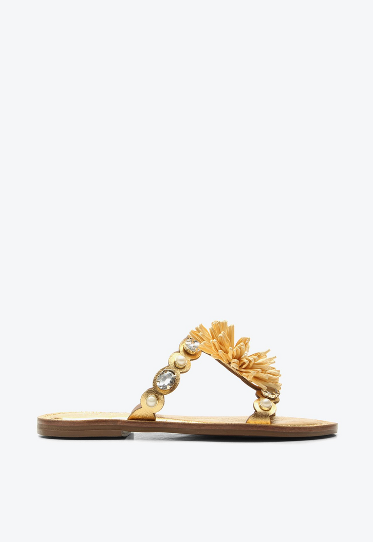 Flat Rochelle em dourado com flor. Um modelo que possui estilo natural, sofisticado e feminino. � uma escolha pr�tica para os dias mais quentes, sendo super leve para compor o look do dia. Com detalhe em pedrarias com cristal glam e maxi flor em r�fia natura, se tornando a composi��o perfeita para trazer destaque na flat. Traz como evid�ncia os pespontos, agregando um charme a mais no visual.