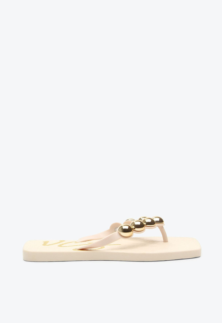 Flat em PVC bege, com tira e detalhes metalizados. Com um recorte frontal quadrado super moderno, essa flat traz sofisticação para a temporada. Se destaca pelos detalhes dourados, que transforma qualquer look. Ideal para quem busca um estilo leve porém marcante.