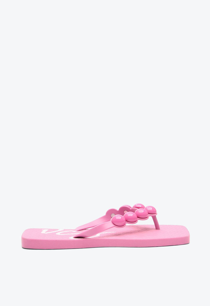 Flat em PVC rosa e tira com detalhes metalizados. Com um recorte frontal quadrado super moderno, essa flat traz sofisticação para a temporada. Se destaca pelos detalhes dourados, que transforma qualquer look. Ideal para quem busca um estilo leve porém marcante.