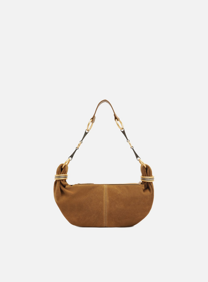 Bolsa hobo pequena em couro acamurçado marrom. O acessório tem formato retangular, laterais arredondadas e acabamento macio. Traz alça de ombro em metais dourados e prateados e tira de couro, presa por argolas e com argolas na base. Possui fecho em zíper e puxador.
