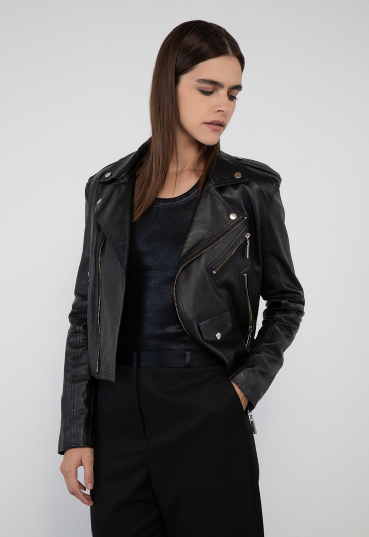 Uma jaqueta de couro super estilosa para te acompanhar em todas as temporadas! De modelagem estilo biker justa ao corpo na altura do quadril, tem bolsos com zíper na frente e abertura com fechamento assimétrico em zíper. Detalhes de pregas e zíper nas mangas, recortes nas costas, bolso falso com aba e aplicações de faixas com botões nos ombros e na cintura deixam essa jaqueta preta ainda mais sofisticada e estilosa! Composição: 100% Couro