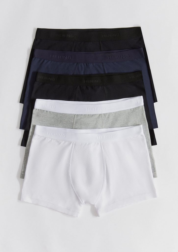 Kit com 5 cuecas elaboradas em malha de algodão e elastano, possui modelagem boxer e elástico personalizado no cós. Item indispensável que garante conforto no dia a dia.Esse kit contém 2 cuecas pretas, 1 branca, 1 cinza e 1 azul.Detalhes da peça:Em malha