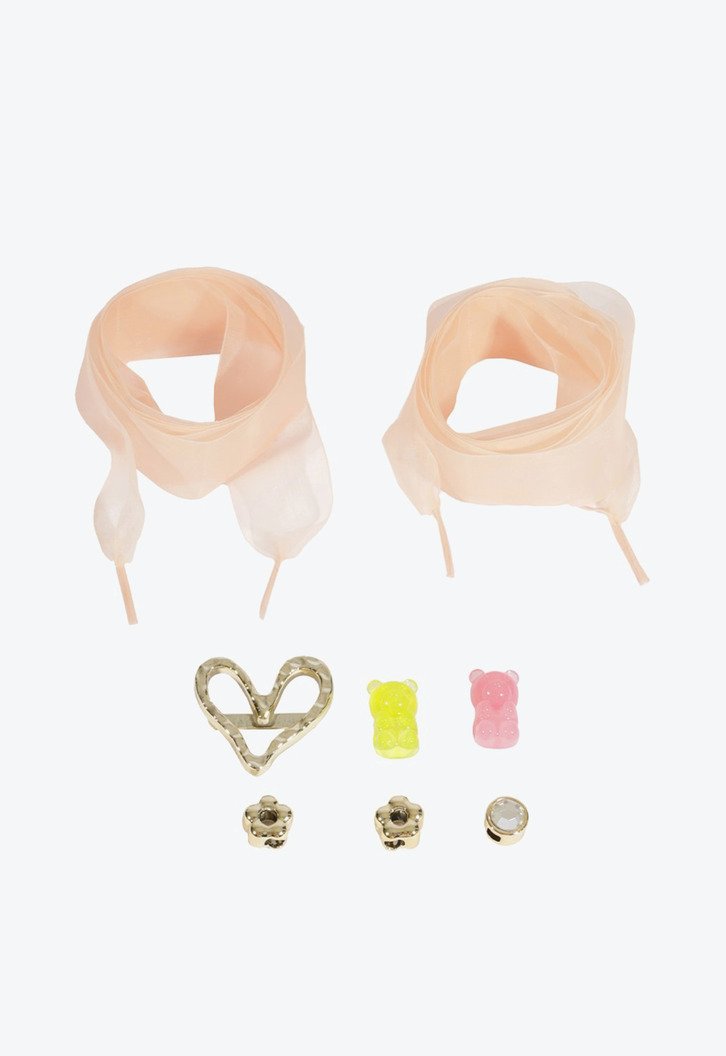Kit personalizável Anacapri, na cor bege. O kit Candy foi idealizado para customizar o estilo do tênis A'25. Contém um atacador em tecido voil com transparência e um conjunto de pins metálicos em diversos tamanhos, com design de corações, flores, pérolas e ursinhos. O kit é vendido separadamente do tênis.