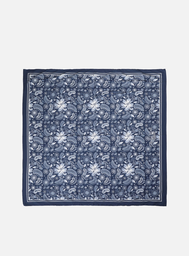 Lenço azul em tecido leve com estampa floral e paisley exclusiva Brizza. Possui formato quadrado e tamanho ideal para diferentes tipos de amarração. Traz aplicação discreta do nome da marca na borda e acompanha embalagem estampada no mesmo padrão.