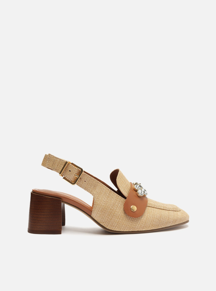 Loafer bege em palha. O modelo tem salto médio bloco, com detalhe curvo interno, e bico quadrado. Fechado, traz recorte lateral na gáspea e aplicação de pedrarias, presas por tira de couro marrom, sobre o cabedal. Possui costura bombada no contorno da biqueira e tira conectada ao cabedal que segue pelas laterais, contorna o calcanhar e fecha em fivela metálica. Com palmilha marrom e inscrição do nome da marca, exibe todo o peito do pé e calcanhar. O modelo vem com tira extra simples para trocar no cabedal.