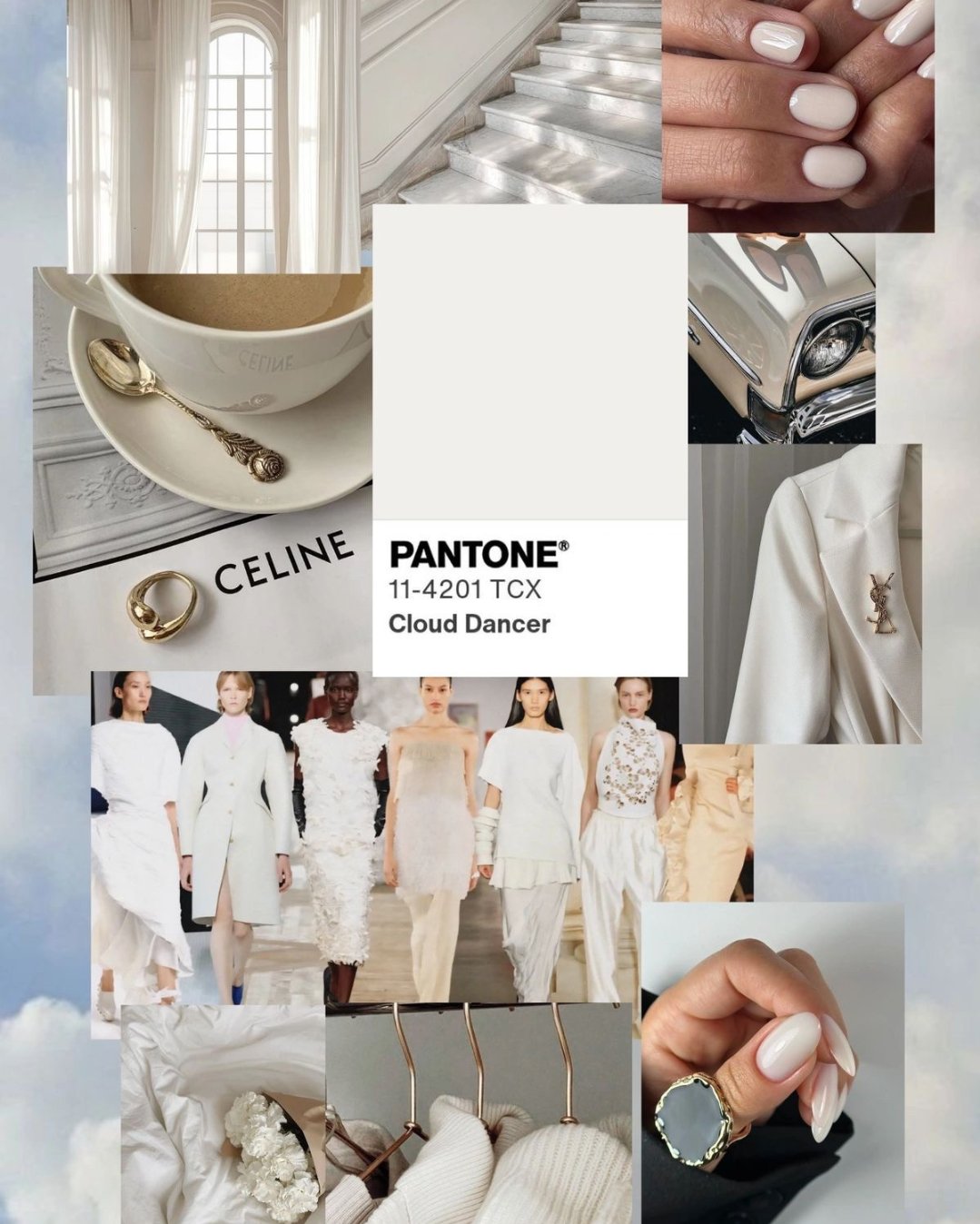 O nome Cloud Dancer, que pode ser traduzido como “dança das nuvens”, reforça essa ideia de suavidade e movimento. A referência às nuvens não está ligada à ausência de forma, mas à sensação de flutuação. É uma cor que não pesa no olhar, não cria contraste agressivo e funciona como uma base para outras cores e texturas.