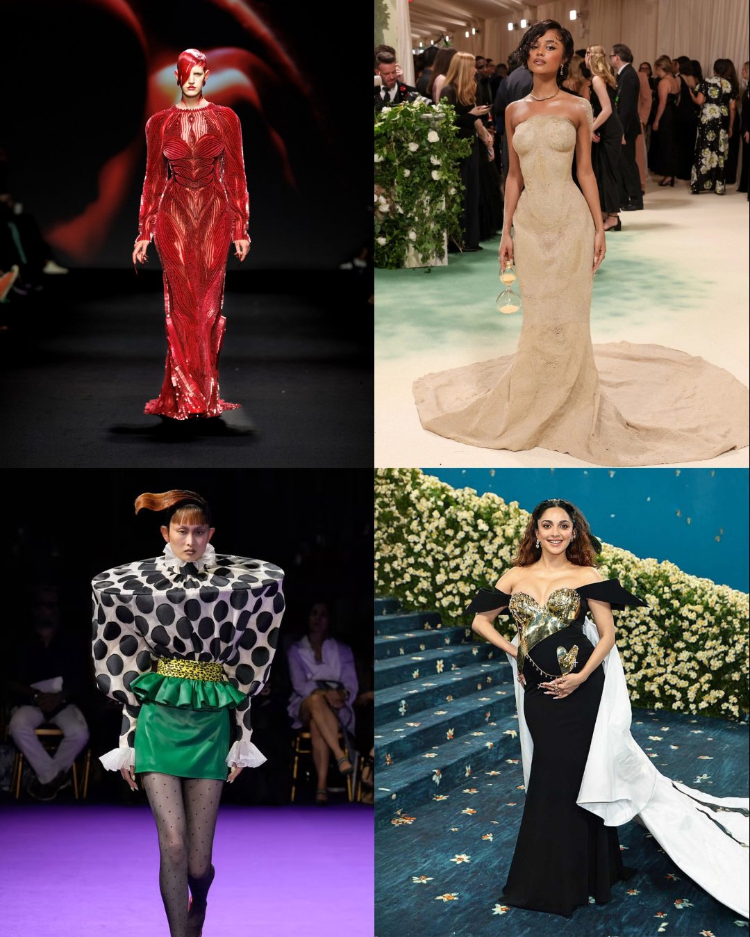 No tapete vermelho, podemos esperar referências que vão do Rococó e Barroco, com sua exuberância e volumes dramáticos ao Renascimento, com drapejados clássicos inspirados em retratos de época. O Surrealismo certamente marcará presença, especialmente através de Schiaparelli e suas formas oníricas. Pop Art deve aparecer em cores vibrantes e referências gráficas, enquanto o Cubismo pode inspirar fragmentação e geometria. E para os mais ousados, a Arte performática abre espaço para transformações ao vivo e intervenções no próprio tapete vermelho.