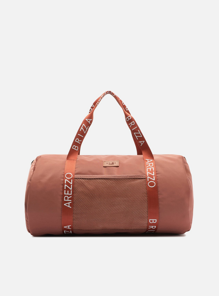 Mala em nylon rosa terroso. O acessório possui shape alongado e arredondado e fechamento superior em zíper. Conta com duas alças de mão e alça longa lateral, removível, regulável e em gorgurão com inscrição Arezzo Brizza, além de suporte para encaixe em mala de rodinhas. Com bolso externo frontal em tela e tag emborrachada do nome da marca.